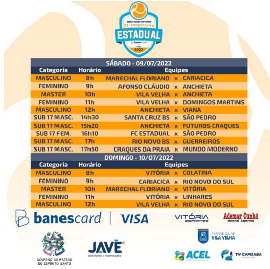 A bola vai rolar nas areias da Praia da Costa. Acontece nesse fim de semana, a segunda rodada do Estadual de Beach Soccer, nas categorias, masculino, feminino, master e sub-17 (masculino e feminino). A competição acontece em frente ao hotel quality, e todos os jogos tem transmissão pelo youtube da Fecabes, a Fecabes TV.